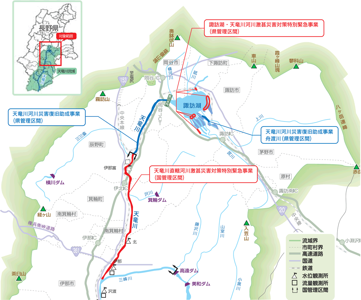 国土交通省中部地方整備局と長野県は激特事業により、平成18年度から概ね5年間で、天竜川(国管理区間)においては河道掘削等を、諏訪湖流入河川(県管理区間)においては諏訪湖合流点に逆流防止水門の設置等を実施し、天竜川での破堤氾濫等の危険性を軽減させ、家屋浸水被害を解消します。