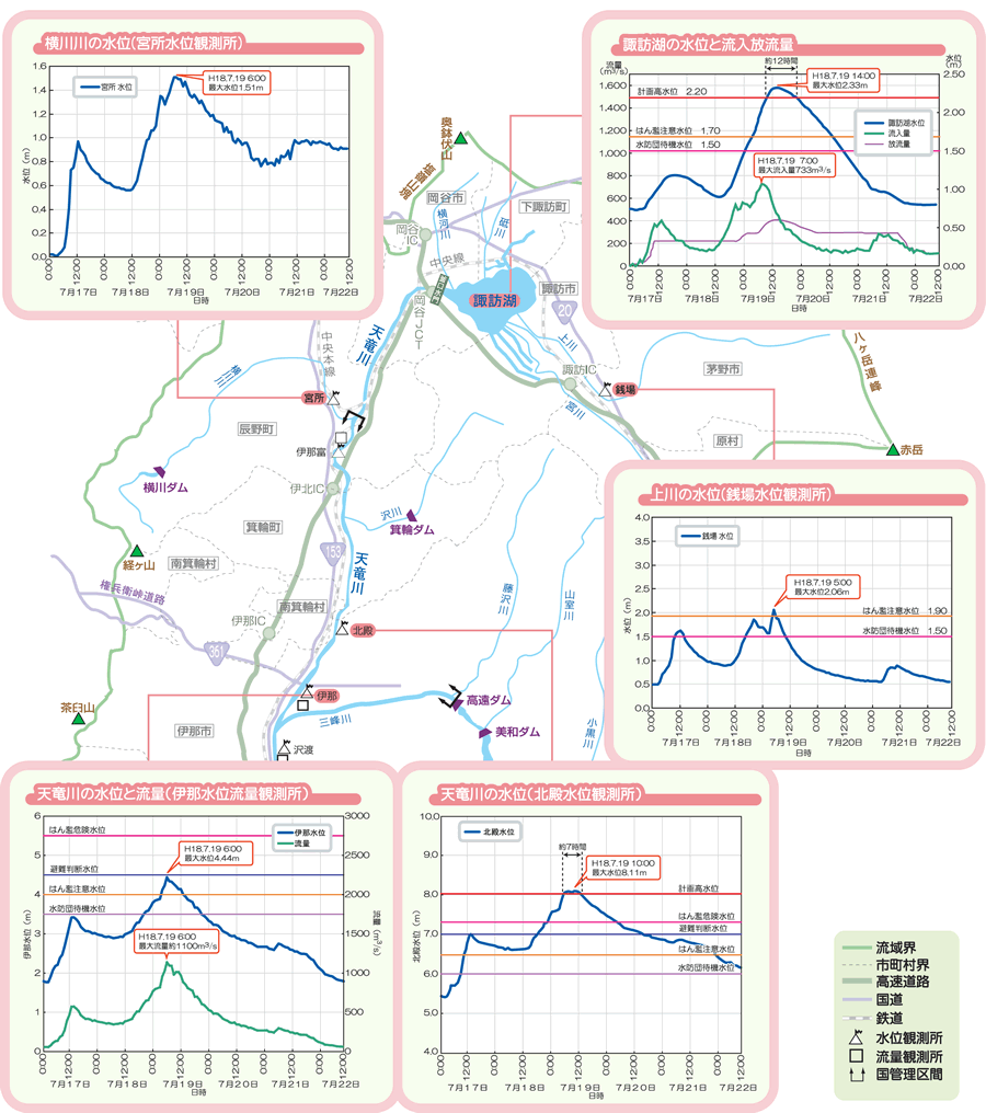 諏訪湖では、この未曾有の豪雨に伴う出水により、平成18年7月19日9時から21時まで、約12時間にわたり湖面水位が計画高水位を上回りました。(最大約13cm)天竜川では、平成18年7月18日22時30分に全ての観測所ではん濫注意水位(警戒水位)を超過しました。北殿水位観測所では、18日19時にはん濫危険水位を超過、さらに19日5時10分に計画高水位を超過してから、12時10分に計画高水位を下回るまで約7時間の間、危険な状態が続きました。この洪水で伊那流量観測所では観測史上最大流量となる約1100m3/sを記録しました。
