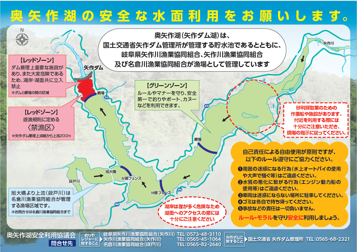 ダム放流に際しては、サイレン、パトロール、情報板、携帯電話でのホームページ情報と、河川の増水に気を付けていただくための警告を行っています。放流による事故が起こらないように、川で過ごす時は各種情報の警告にご注意とご協力下さいますようお願いいたします。